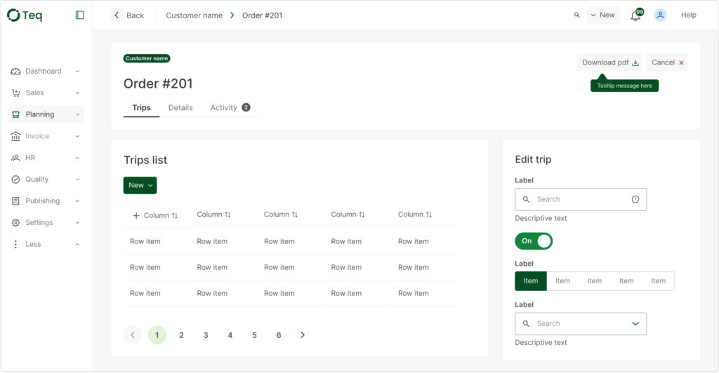 Etter å ha prøvd ut komponentene i forskjellige moduler som kan være aktuelle, lager jeg layout som kan inneholde tabeller og litt mer realistisk oppsett av en av sidene i TEQ. Her er starten på en layout for en kundeordre med turer og ordreinstillinger.