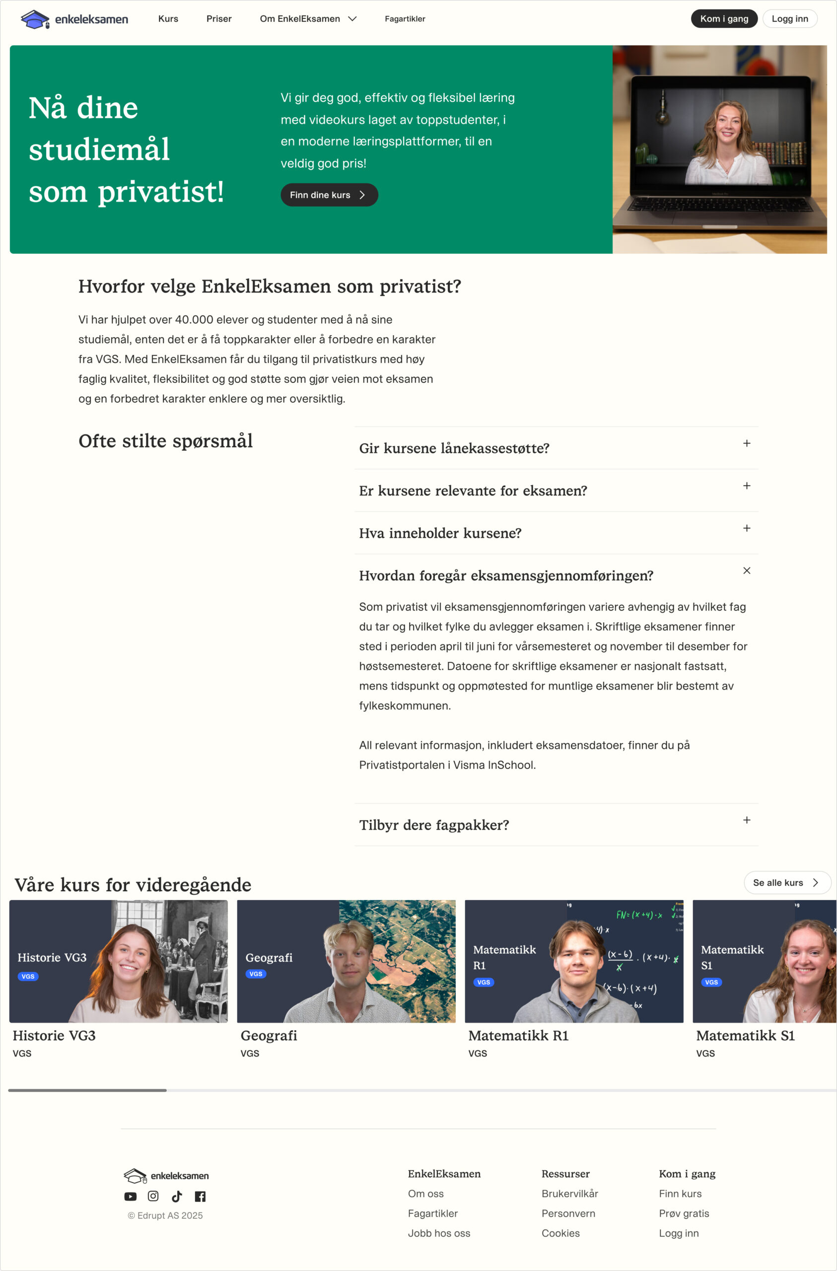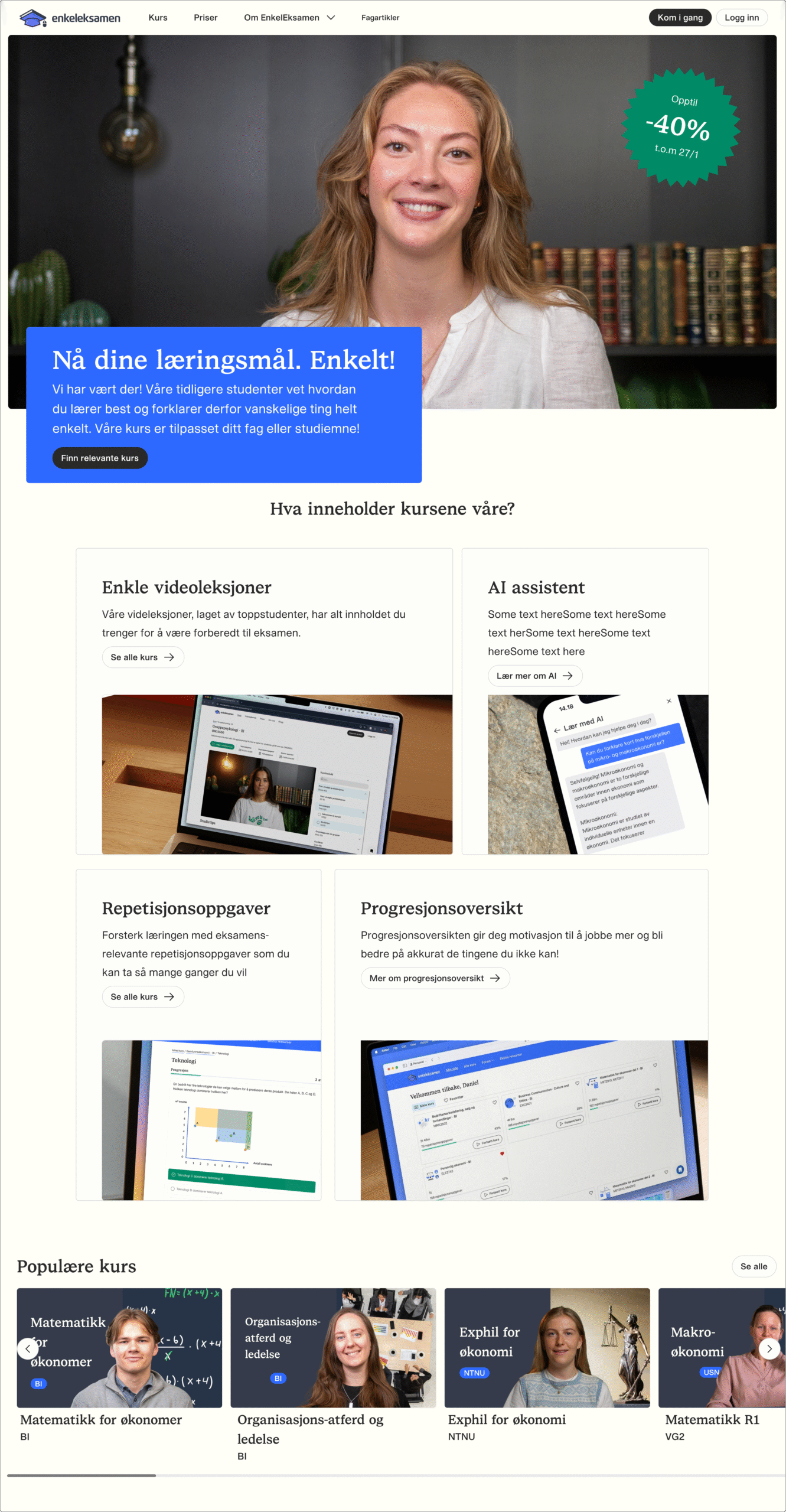 Jeg lagde også en forbedret forside og flere maler til undersidene tik Enkeleksamen. I det nye designet av forsiden økte jeg fokuset på en liten og tydelig CTA, sammen med et stort, selgende bilde og en bento-løsning for å vise fordelene ved å velge Enkeleksamen.